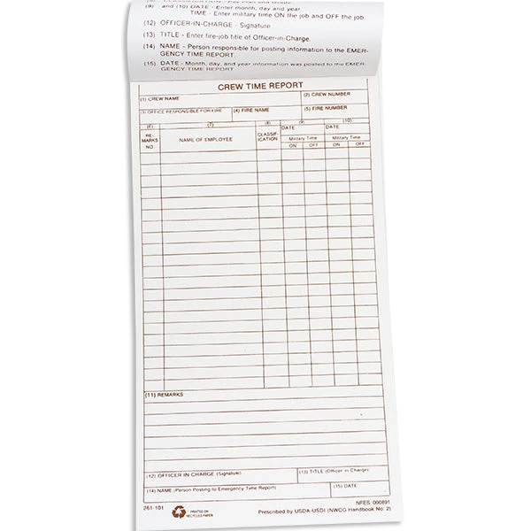 Keep track of your entire crew’s hours with the NFES 00891 Crew Time Repot (CTR). Book contains 50 CTR sheets with carbon copies.